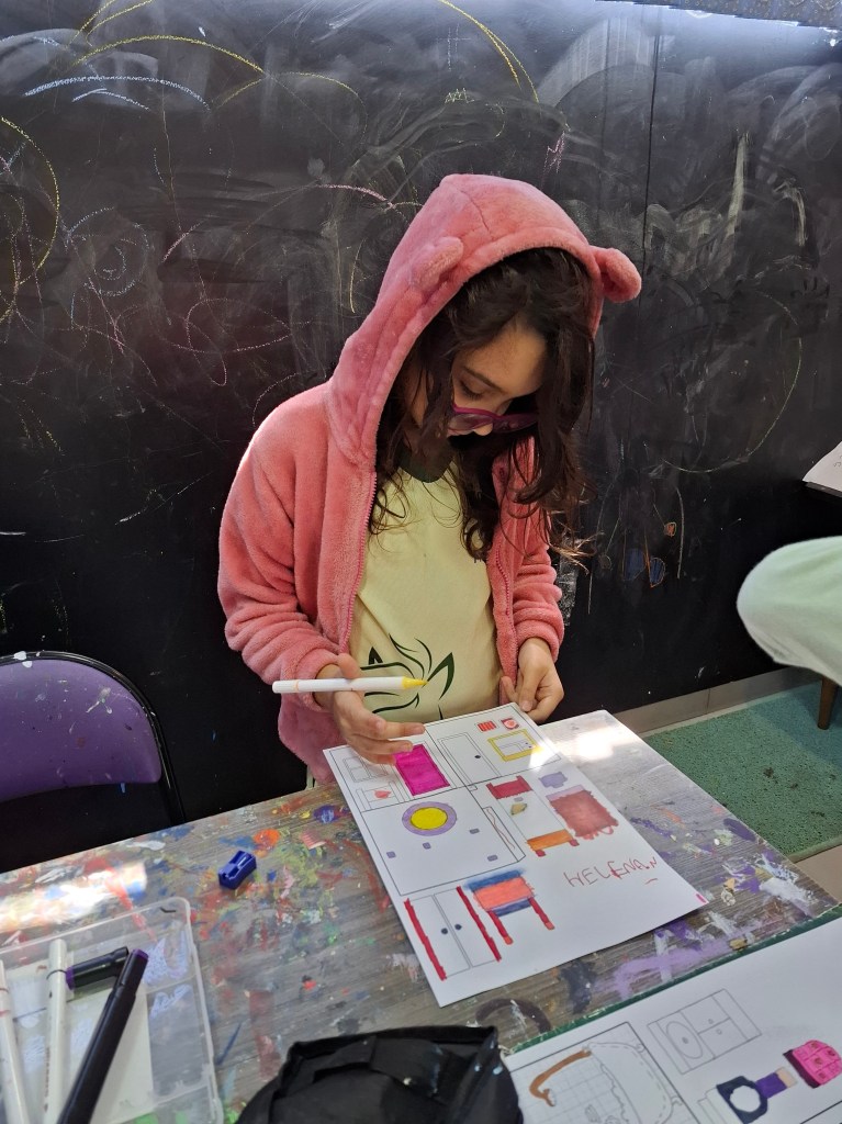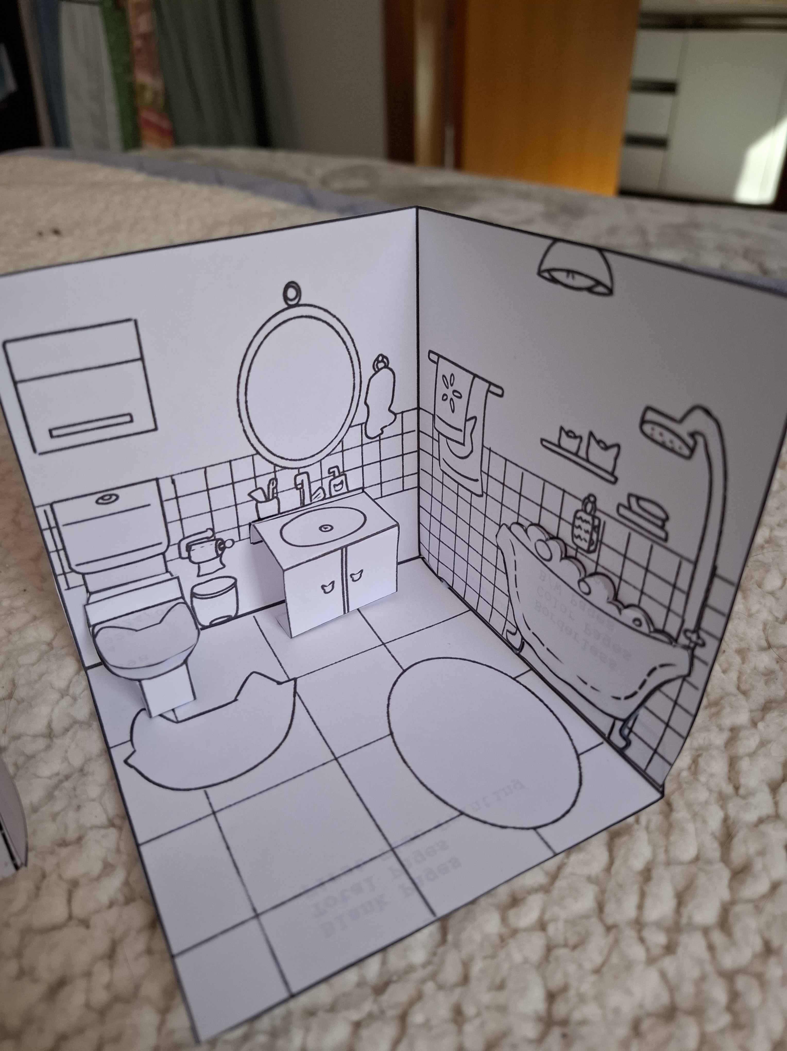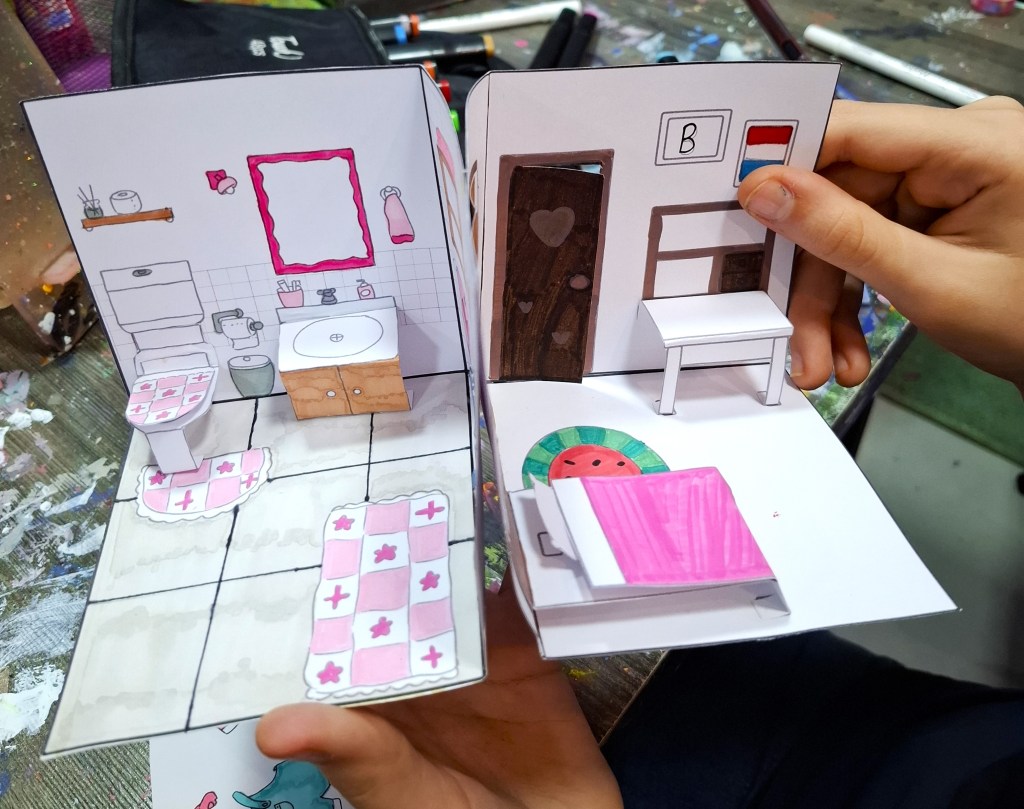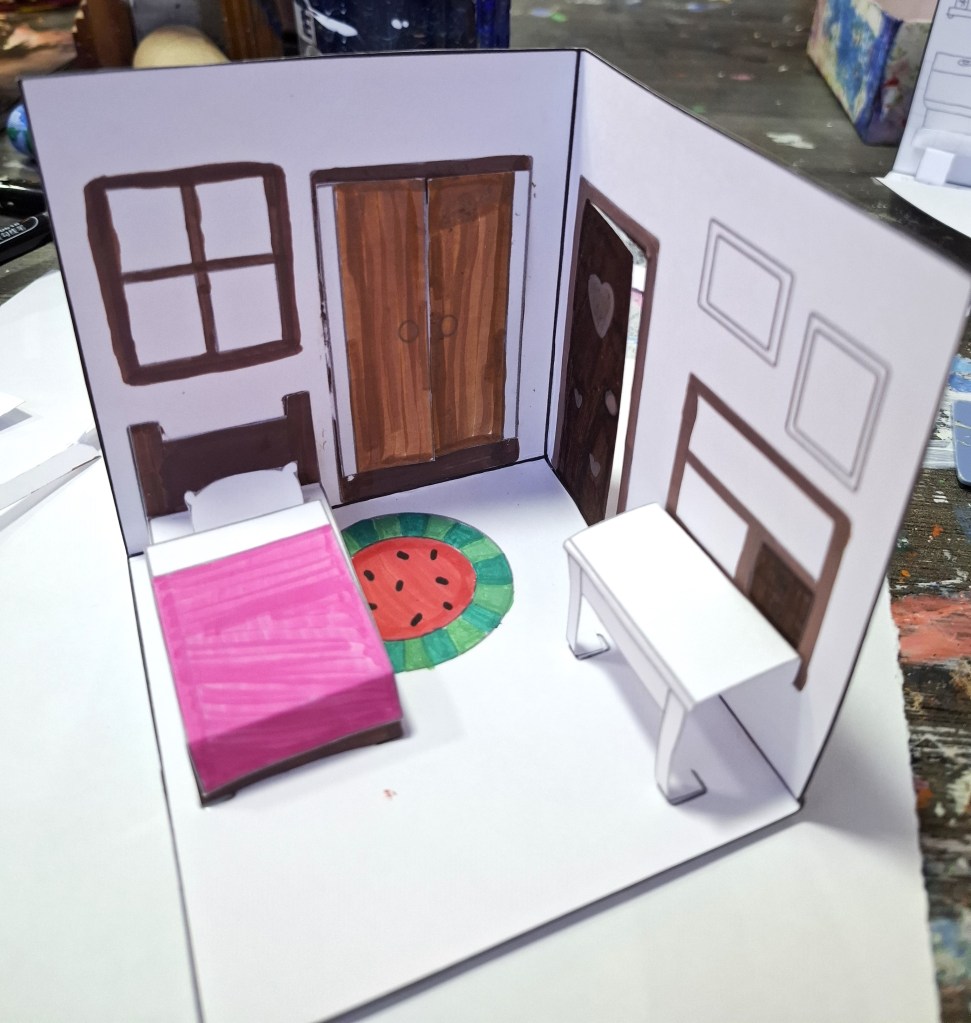 Para desenvolver a pintura dos alunos na aula, pensei no primeiro modelo para colorir. Montei a arte em cima de um molde para caber em um A4 e fiz um teste em papel sulfite para entender como montar de uma maneira em que os cômodos possa virar um livro pop up. Na primeira ideia teriam portar nos cômodos, mas acabei tirando para ter mais espaço para os móveis.