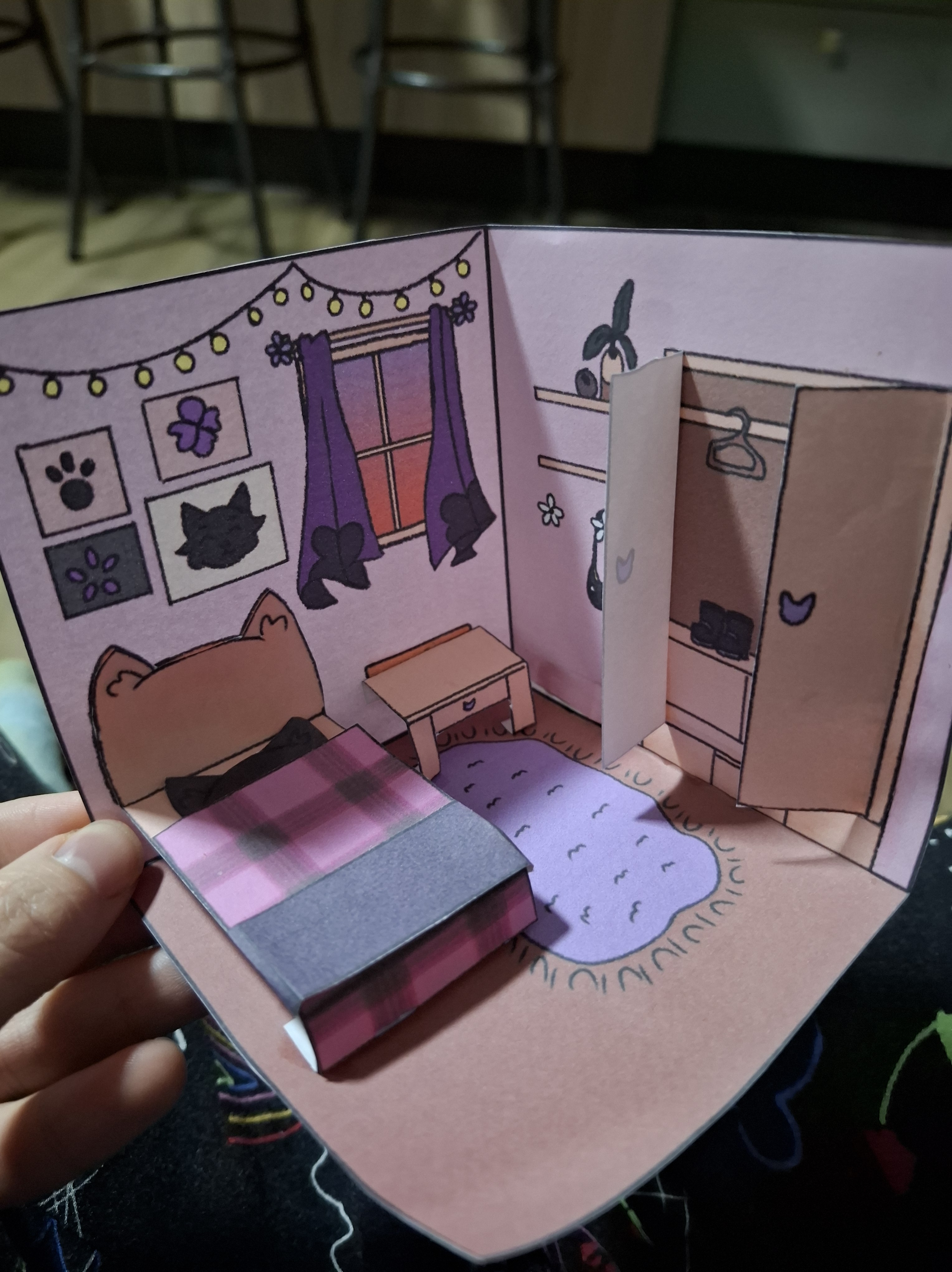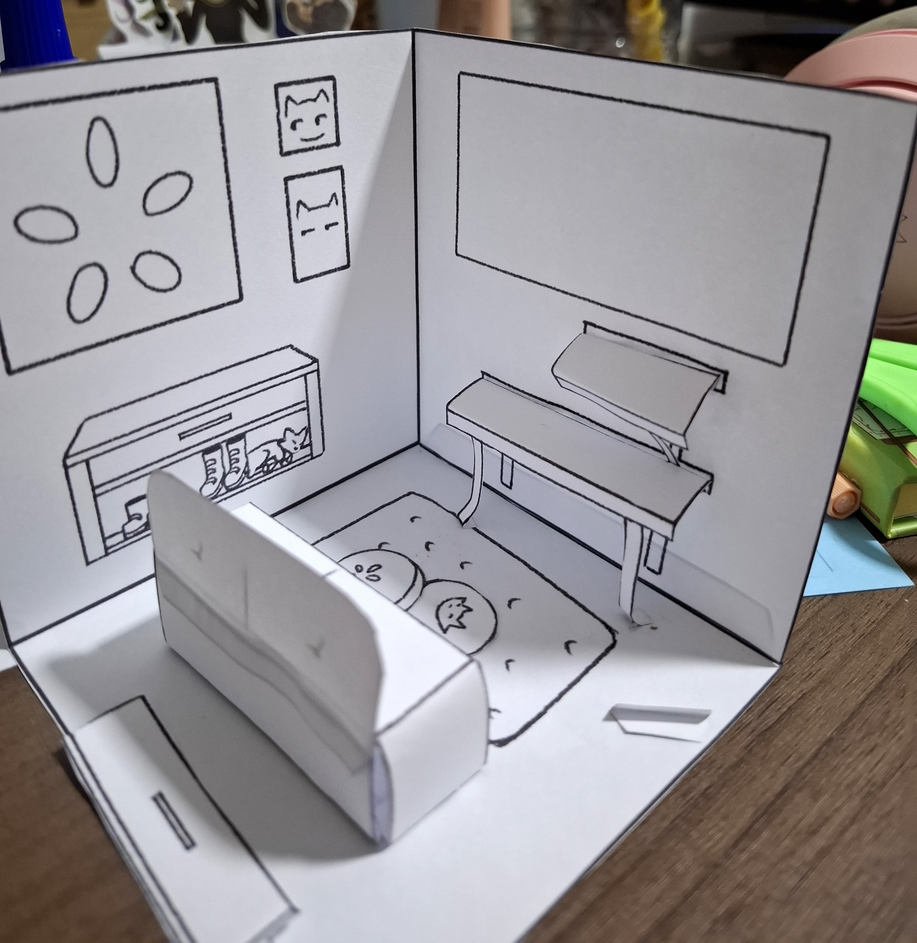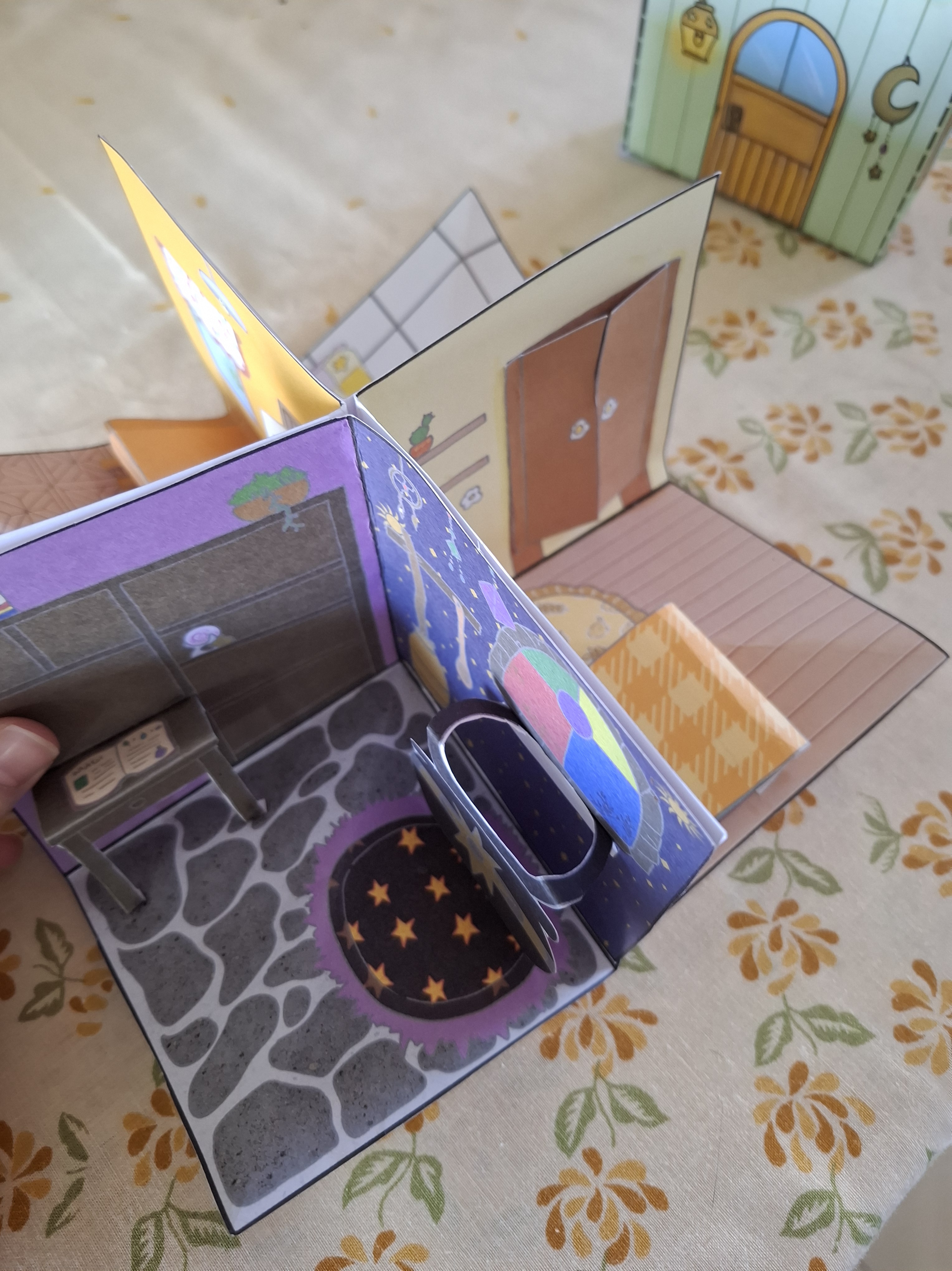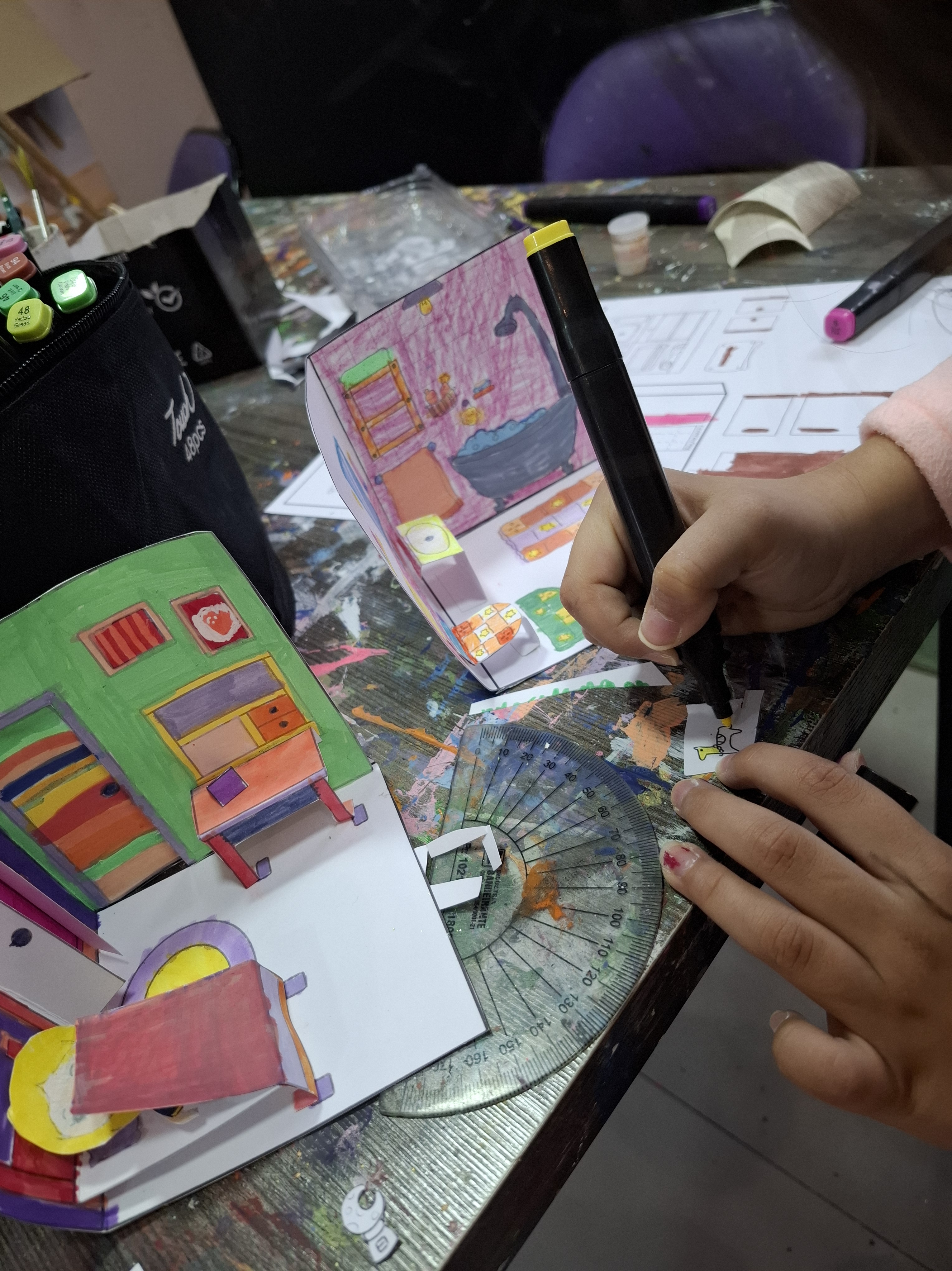 Para desenvolver a pintura dos alunos na aula, pensei no primeiro modelo para colorir. Montei a arte em cima de um molde para caber em um A4 e fiz um teste em papel sulfite para entender como montar de uma maneira em que os cômodos possa virar um livro pop up. Na primeira ideia teriam portar nos cômodos, mas acabei tirando para ter mais espaço para os móveis.