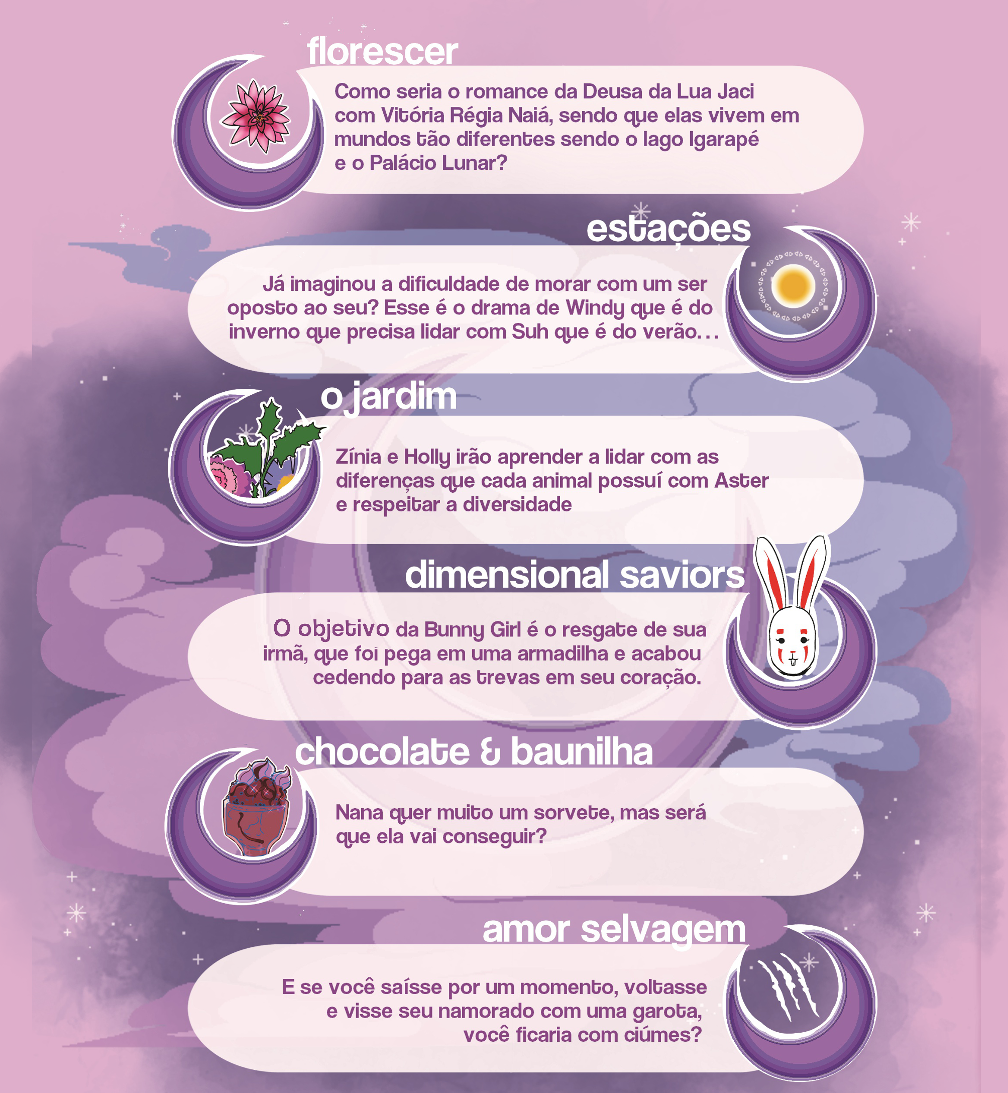 Nosso primeiro quadrinho impresso, publicado em 2023. Nessa coletânea contamos seis histórias curtas, além de curiosidades sobre o universo dos contos e dos personagens. A segunda edição de Contos Lunares vai ser lançada esse ano, segundo semestre de 2025, com novos personagens e histórias.